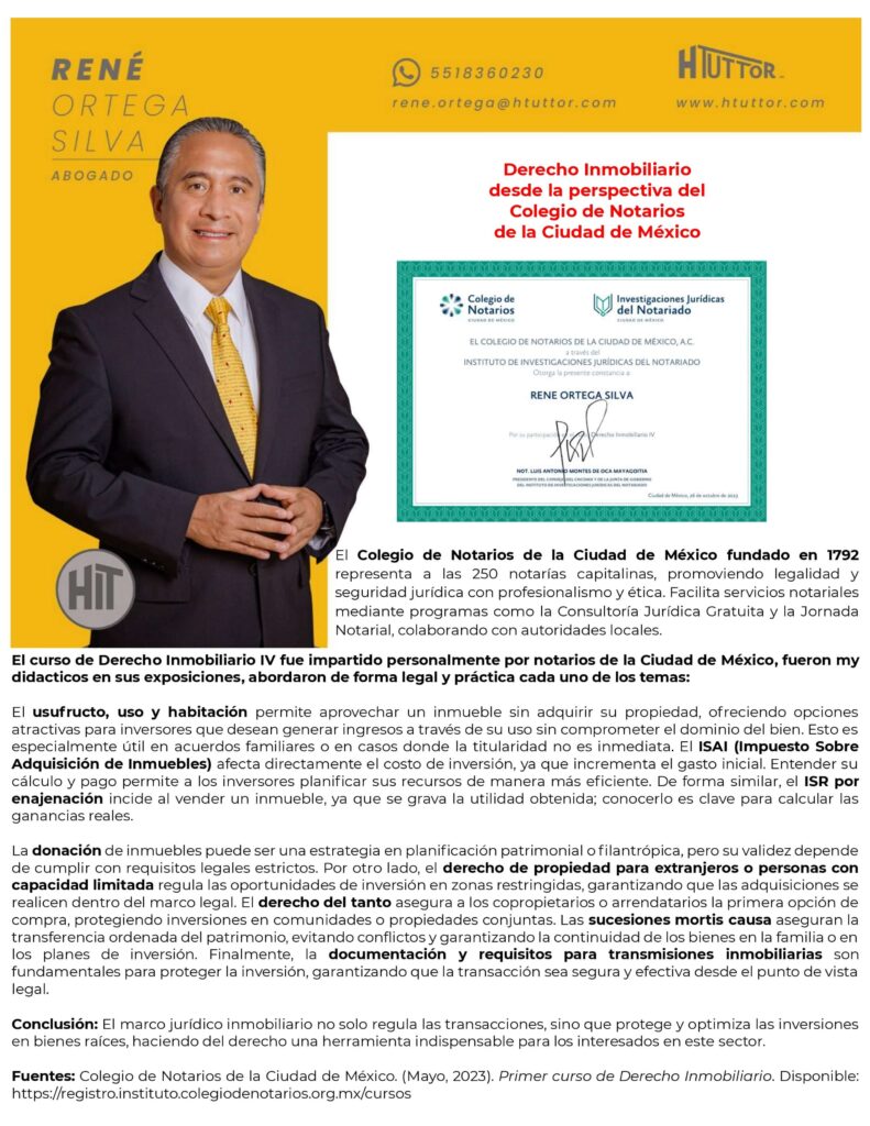 Derecho Inmobiliario desde la perspectiva del Colegio de Notarios de la Ciudad de México El Colegio de Notarios de la Ciudad de México fundado en 1792 representa a las 250 notarías capitalinas, promoviendo legalidad y seguridad jurídica con profesionalismo y ética. Facilita servicios notariales mediante programas como la Consultoría Jurídica Gratuita y la Jornada Notarial,