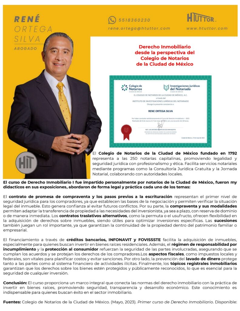 Conclusión: El curso proporciona un marco integral que conecta las normas del derecho inmobiliario con la práctica de invertir en bienes raíces, promoviendo seguridad, transparencia y desarrollo económico. Este conocimiento es indispensable para quienes buscan éxito en el sector inmobiliario.